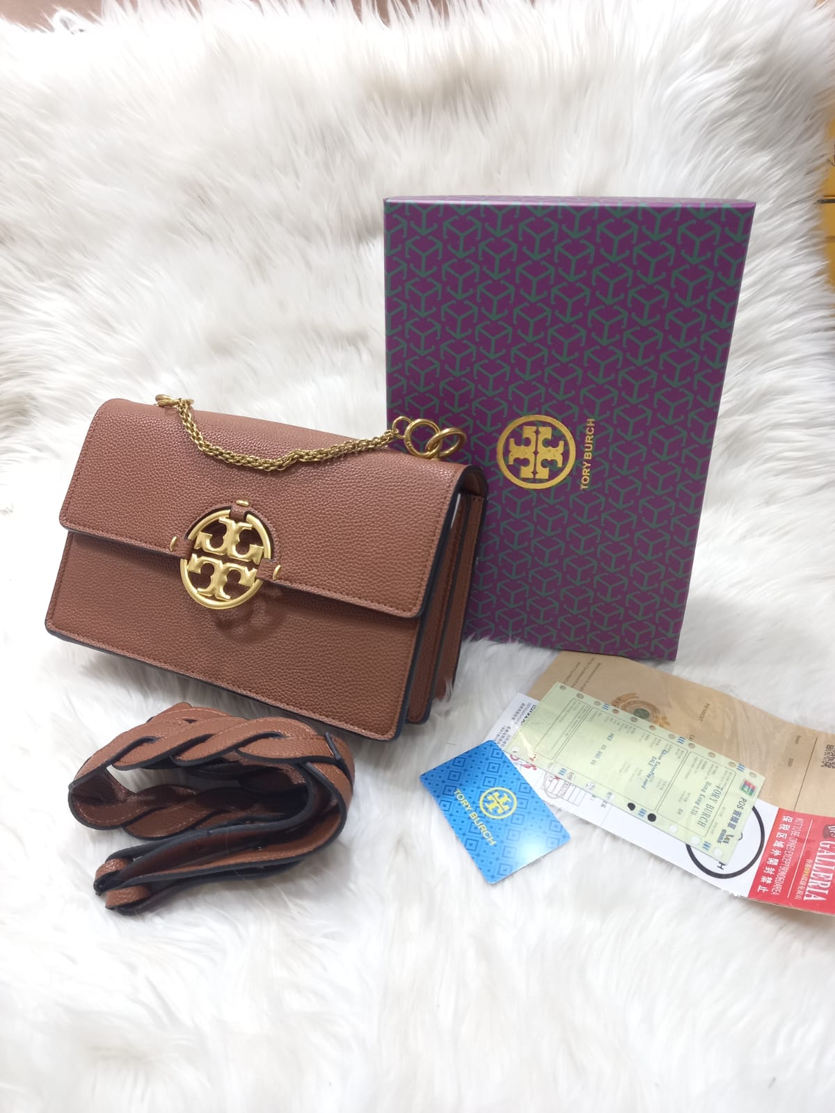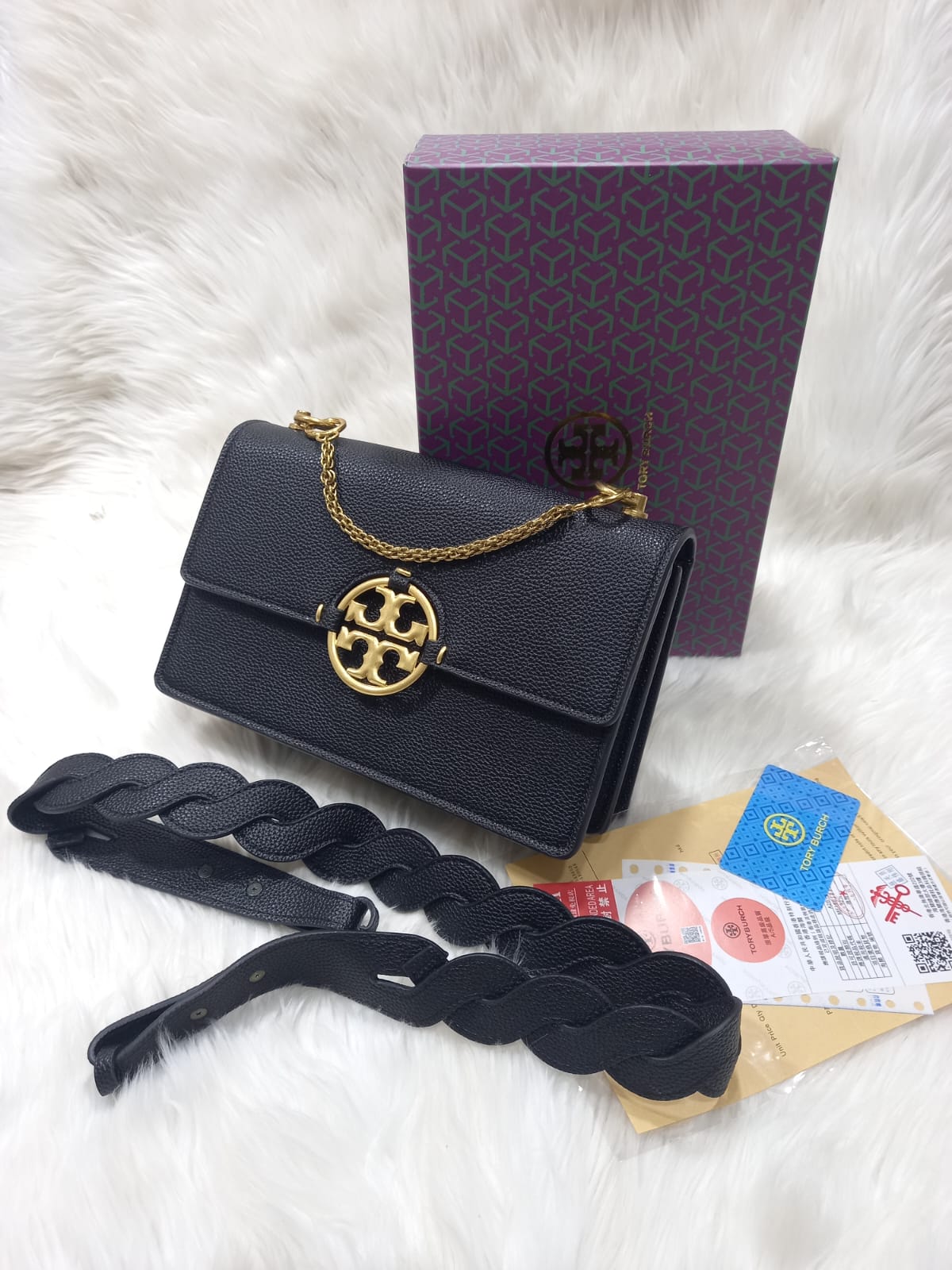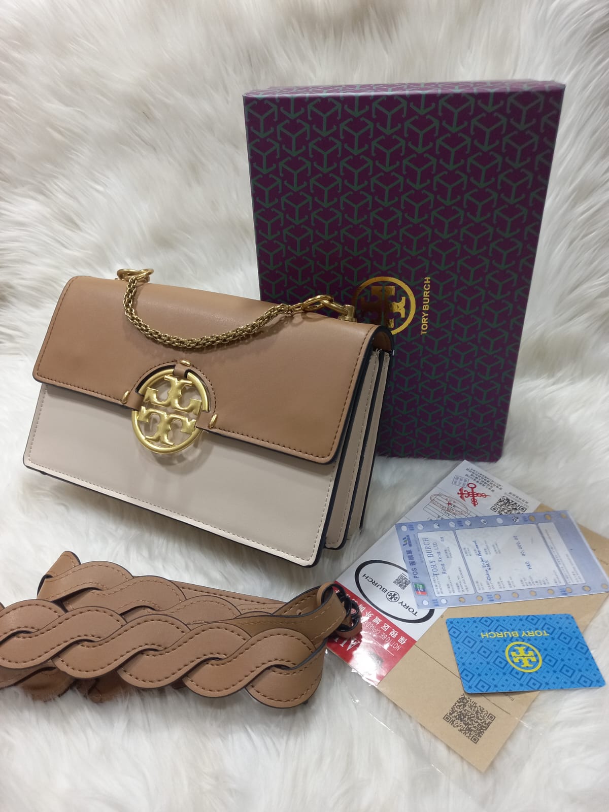 - Hardware: Gold-tone Double T logo