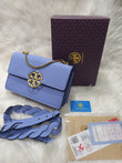 This beautifully crafted bag features premium pebbled leather in stunning color-block combinations that create visual interest and modern appeal. The signature oversized gold Double T logo serves as a striking focal point on the front flap, instantly recognizable as classic Tory Burch design. The structured silhouette maintains its elegant shape while the luxurious microfiber lining with a suede-like finish adds a refined touch to the interior.