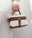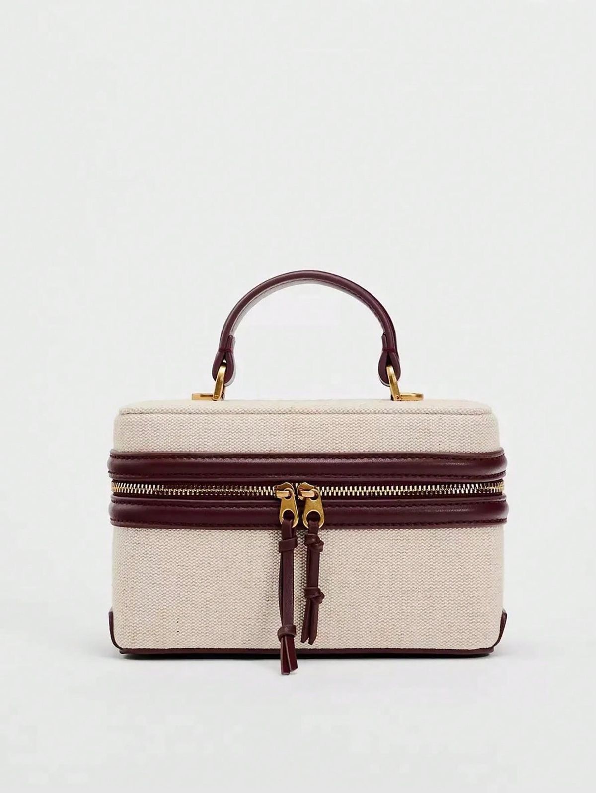 This beautifully crafted bag features a structured box silhouette in premium materials with contrasting leather trim in rich brown tones. The dual-zip closure design adds both visual interest and practical functionality, allowing easy access to your essentials while keeping them secure. The gleaming gold-tone hardware and zipper pulls add a luxurious touch that catches the light beautifully.